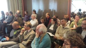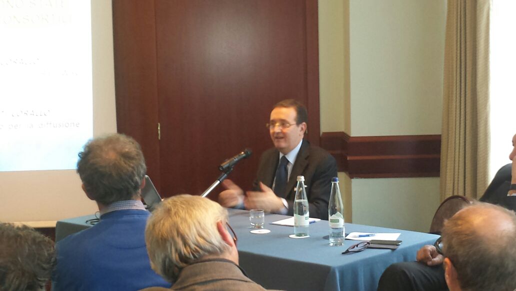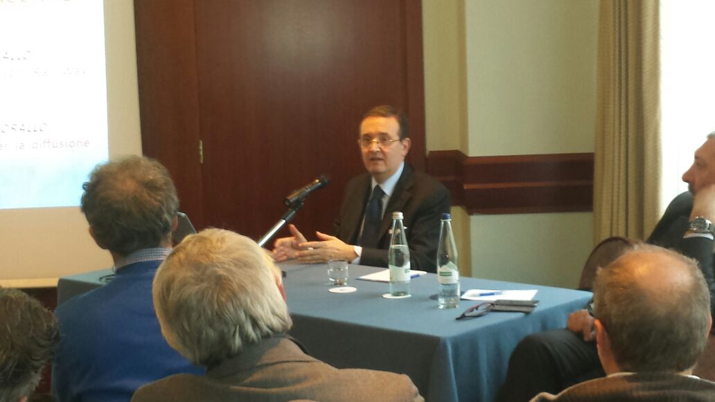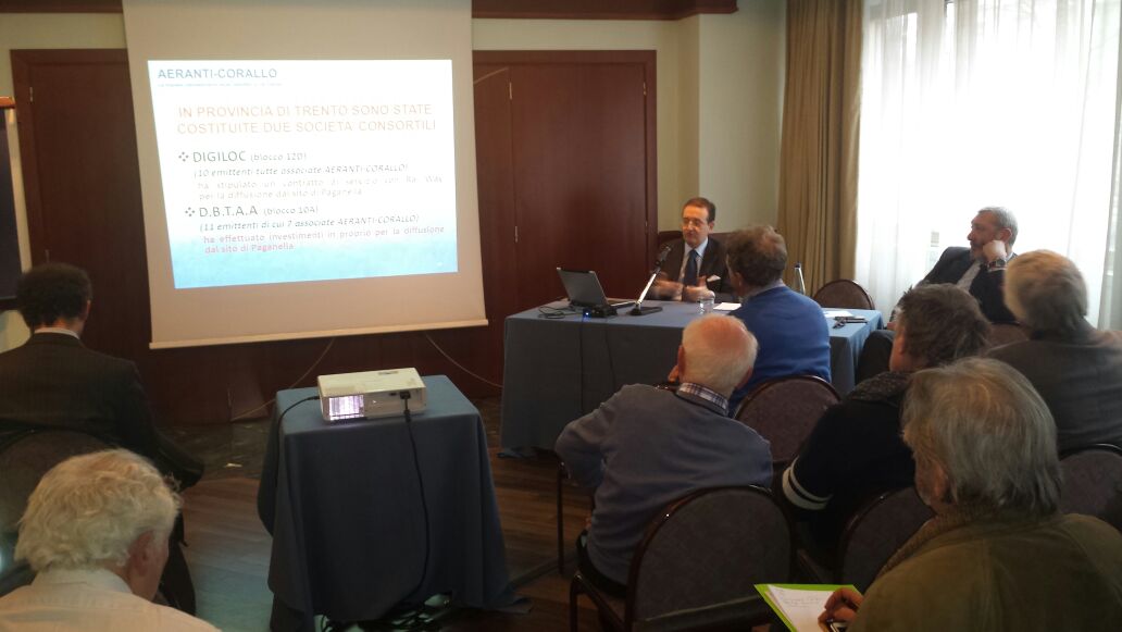 Un’immagine dell’incontro, svoltosi a Torino, con le imprese radiofoniche locali associate che fanno servizio nelle province piemontesi di Torino e di Cuneo e in Valle D’Aosta, finalizzato a esaminare la recente delibera Agcom n. 602/14/CONS sull’avvio del digitale radiofonico nei due bacini del Piemonte occidentale e della Valle D’Aosta. L’illustrazione del tema è stata svolta dal coordinatore Aeranti-Corallo, avv. Marco Rossignoli