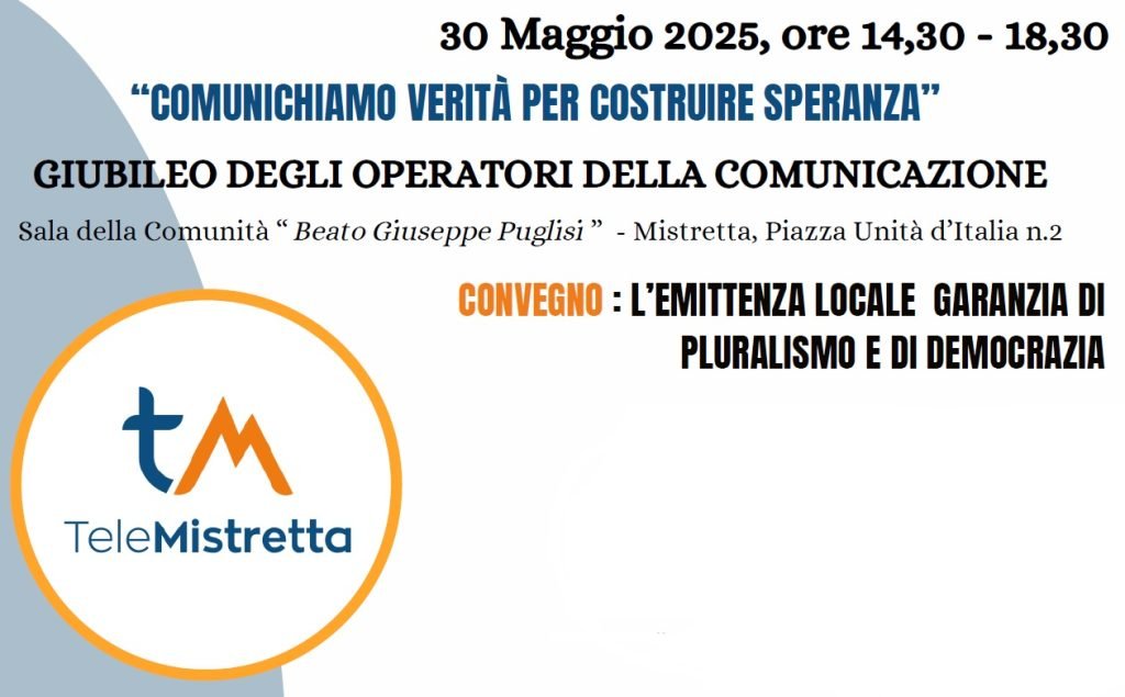 CONVEGNO “L’EMITTENZA LOCALE GARANZIA DI PLURALISMO E DI DEMOCRAZIA” ORGANIZZATO DA TELEMISTRETTA Si è svolto venerdì 30 maggio 2025, nella Sala della Comunità “Beato Giuseppe Puglisi”, a Mistretta (ME), il convegno organizzato da Telemistretta sul tema “L’emittenza locale garanzia di pluralismo e di democrazia”, in occasione del Giubileo degli operatori della comunicazione. Dopo l’introduzione del […]